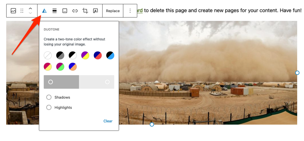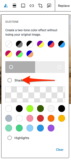 The Duotone selector also will allow the selection of custom colors for the “shadow” and “highlight” colors